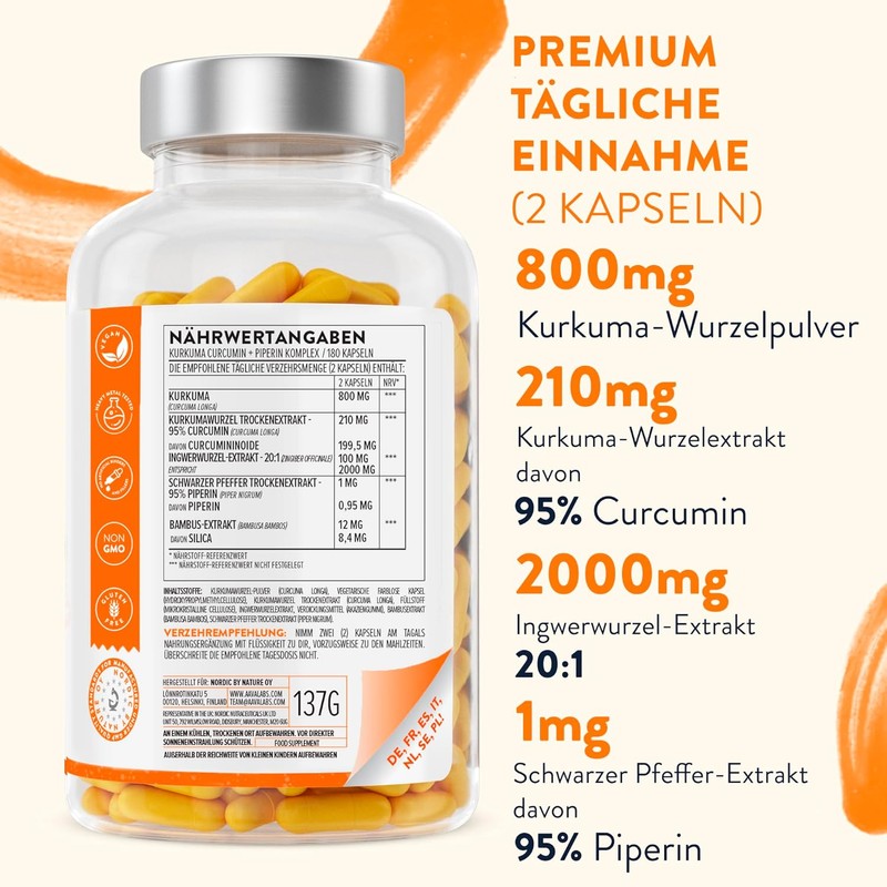 AAVALABS® turmeric capsules high dose - 4230 mg 95% curcumin extract complex, curmeric powder and piperine per daily dose - 180 capsules - Vegan and laboratory tested - Made in the EU