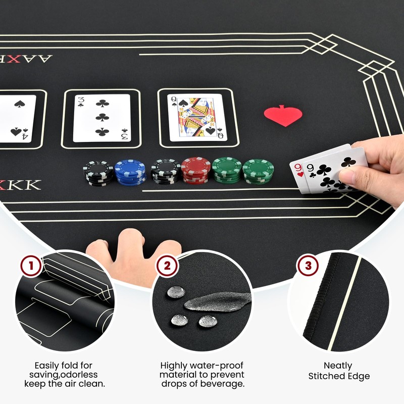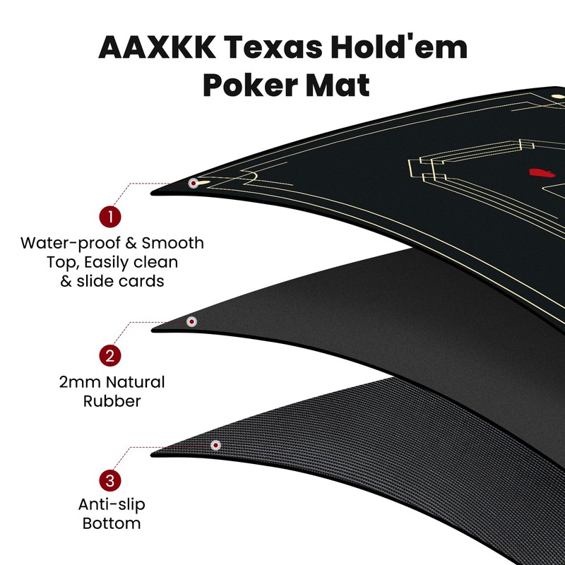 • [Aesthetics Meet Practical Use]: AAXKK poker table tops has precision digital printing, designs are based on practical use. For example,middle has five square to put the cards,and a bigger square to separate player's cards and chips with beting chips. With these features, we can say it is a professinal TEXAS HOLD'EM Poker Mat.