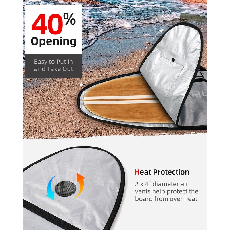 • Extra Protection: 2 x 4" air vents for heat protection; Thickened nylon for head protection. *Please note: this surfboard bag is designed for indoor storage ONLY; as outdoor storage in the sun would substantially shorten the life of this bag.