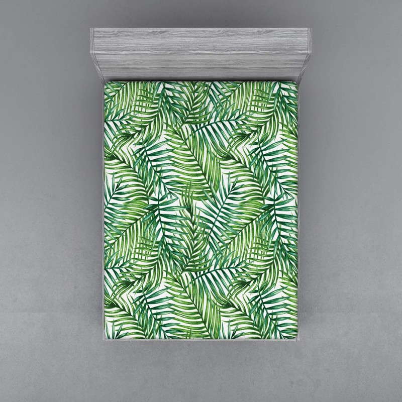 ABAKUHAUS Leaf Fitted Sheet, Botanical Wild Palm Trees, Soft Decorative Fabric Bed Linen All-Round Elastic Band, 160 x 200 cm, Green White