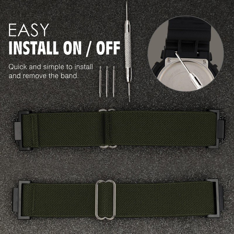 - ▶ Package include, Elastic nylon strap, one set of lightweight plastic Compatible gshock adapters, three width 16mm spring bars to connect the adapters to your watch, two width 22mm spring bars to attach elstic band to the adapters.