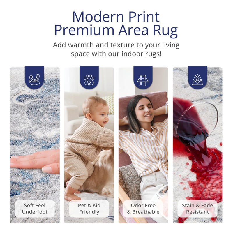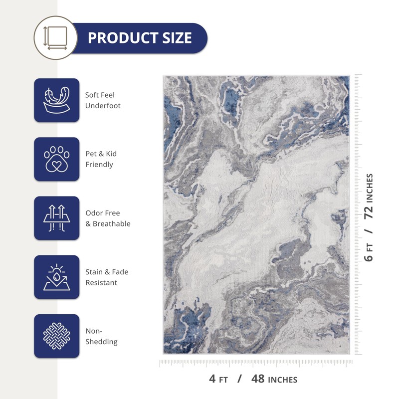 - STYLE: This area rug with a blue and grey color scheme and an abstract marble design can add sophistication and style to any space. The combination of the two colors creates a cohesive and harmonious look, while the abstract mable pattern adds interest and texture to the desig