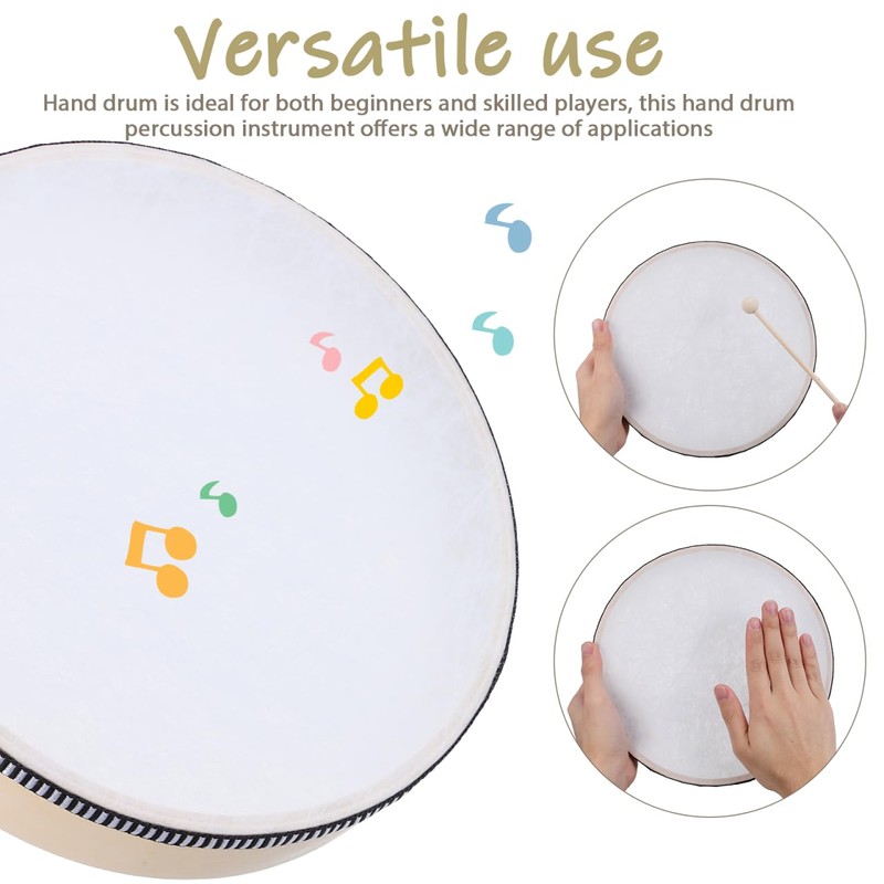 The hand drum percussion instrument with a drum stick is suitable for both beginners and experienced musicians. This drum is designed for various settings, including drum circles, music classes, and personal practice. Its sturdy wooden frame allows durability.