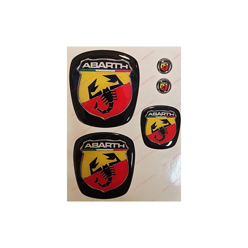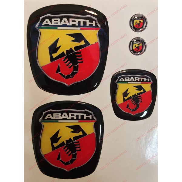 Abarth Logo for Car Front, Rear and Steering Wheel + 2 Keyring Emblems For car bonnet and boot. 3D effect resin stickers. Scorpion design on black background.