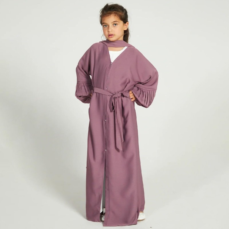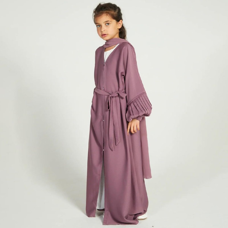 - Girls Open Abaya With Pleated Cuffs: The Muslim Abaya long sleeve snap front maxi dress Kimono Dubai robe dress for girl, helps your girl create a simple and adorable look.