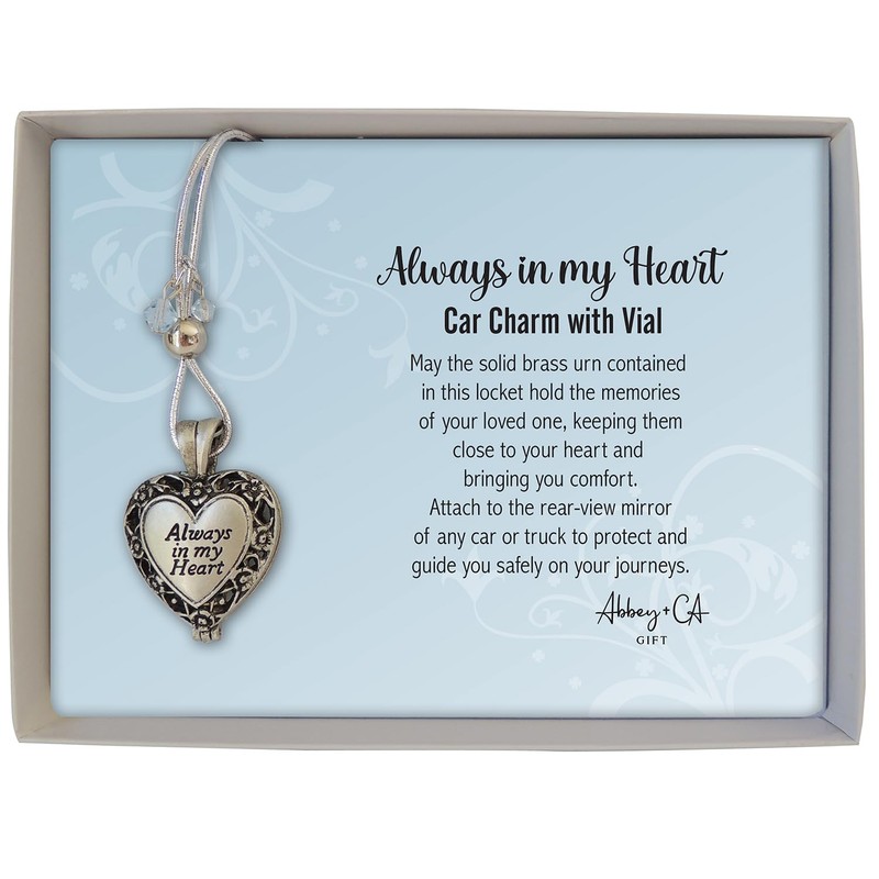 Abbey + CA Gift Always in My Heart Memorial Heart Locket Car Charm with Vial for Ashes, Bereavement and Sympathy Gift for Loss of Loved One