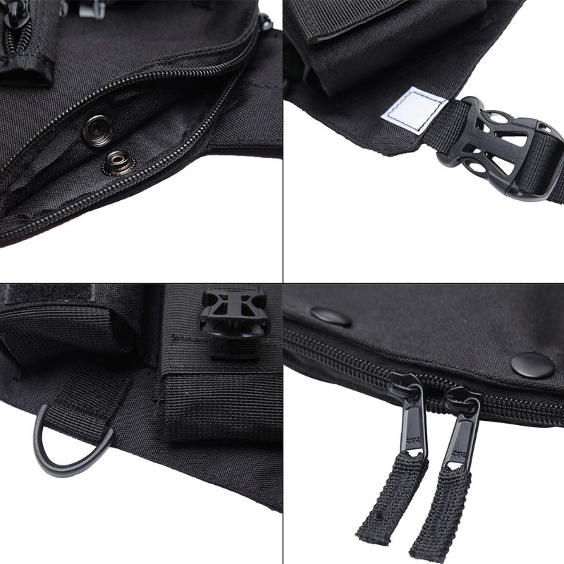 - Both pockets adjust in length and girth;so you can put your primary radio on either side Pocket with zips so that you can put important goods such as cellphone and document