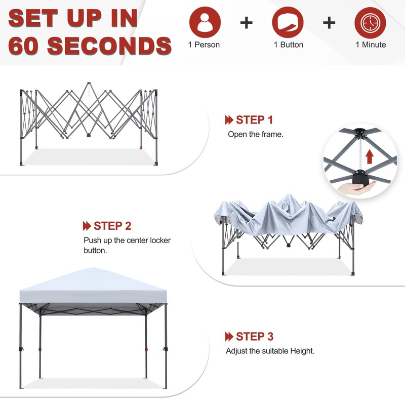 - ❤【Easy to Install and Transport with One Person】This pop up canopy installation just requires attaching the top to the canopy frame, pushing up from the center of the frame, and finally adjusting the height of the legs.