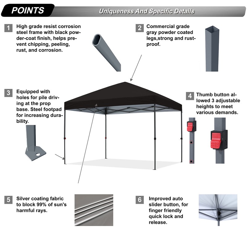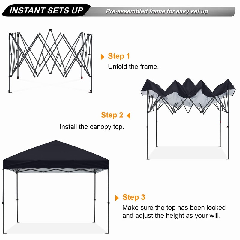 - 【MULTIPLE CHOICE】:ABCCANOPY pop up canopy available in 6.6x6.6ft, 8x8ft, 10x10ft or 12x12ft, multiple colors making them great for couples, families,or small gatherings in the backyard with friends. 【TIPS:please do not leave this canopy outside in wild weather, especially stormy weather, remove the top from frame and stored in the storage bag after dry】Check above to find the perfect fit for you!