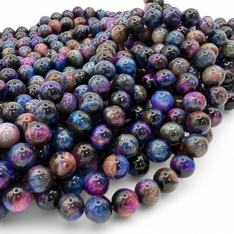 - Enhance your jewelry with African Galaxy Tiger’s Eye Round Beads, featuring a mesmerizing mix of deep blues & purples hues. Each 15.5-inch strand is heat-treated to enhance its vibrant, natural beauty.