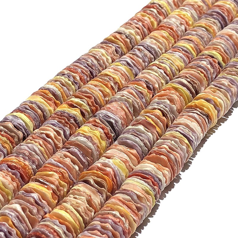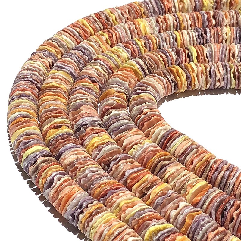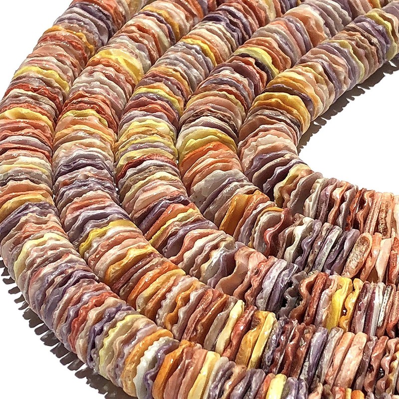 - Each bead is handcrafted from a small section of a rainbow pectin scallop shell, carefully cut and polished to bring out the shell's natural beauty. The beads come in a variety of shapes and sizes, ranging from small rounds to larger discs and ovals, and are perfect for creating one-of-a-kind necklaces, bracelets, and earrings.