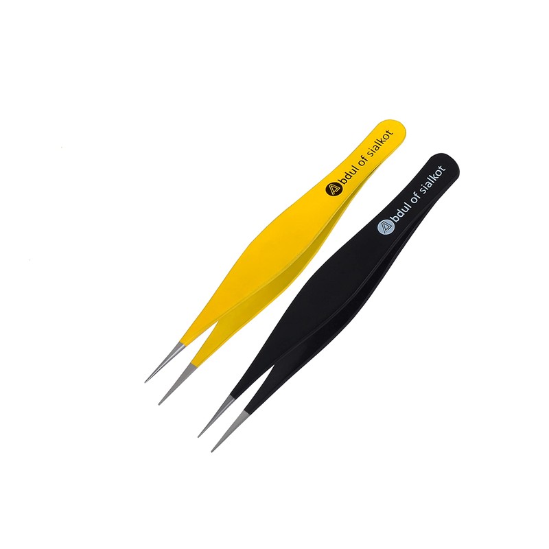 Abdul of Sialkot Pinzette für Damen & Herren – Professionelle Pinzette aus Edelstahl, spitze Pinzette für eingewachsene Haare, Splitter und Mitesserentferner, 2er-Set (schwarz & gelb)