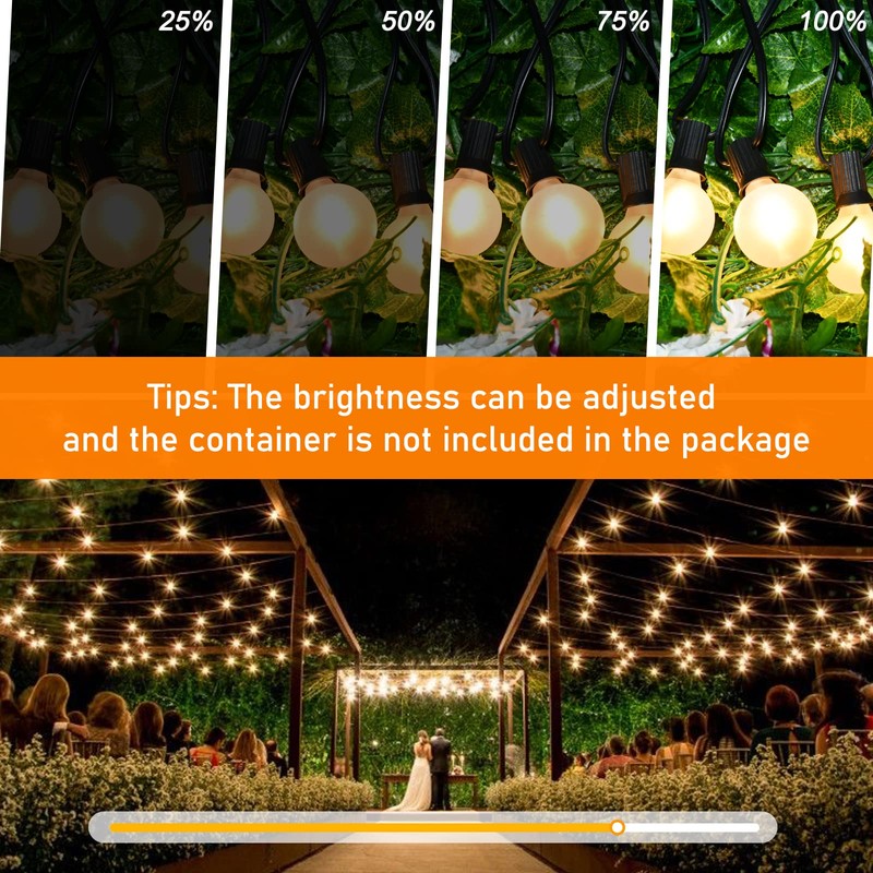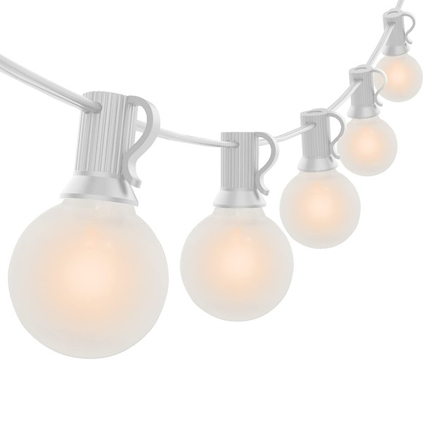 - Outdoor Led String Lights: 25Ft led frosted white string light with 25 led bulbs and 2 spare bulbs, G40 led frosted white bulbs is C7/E12 Candelabra base, Frosted white globe light bulbs to create fantastic atmosphere. Perfer for decks, weddings, party, umbrellas, backyard, pergola decorations and lighting.