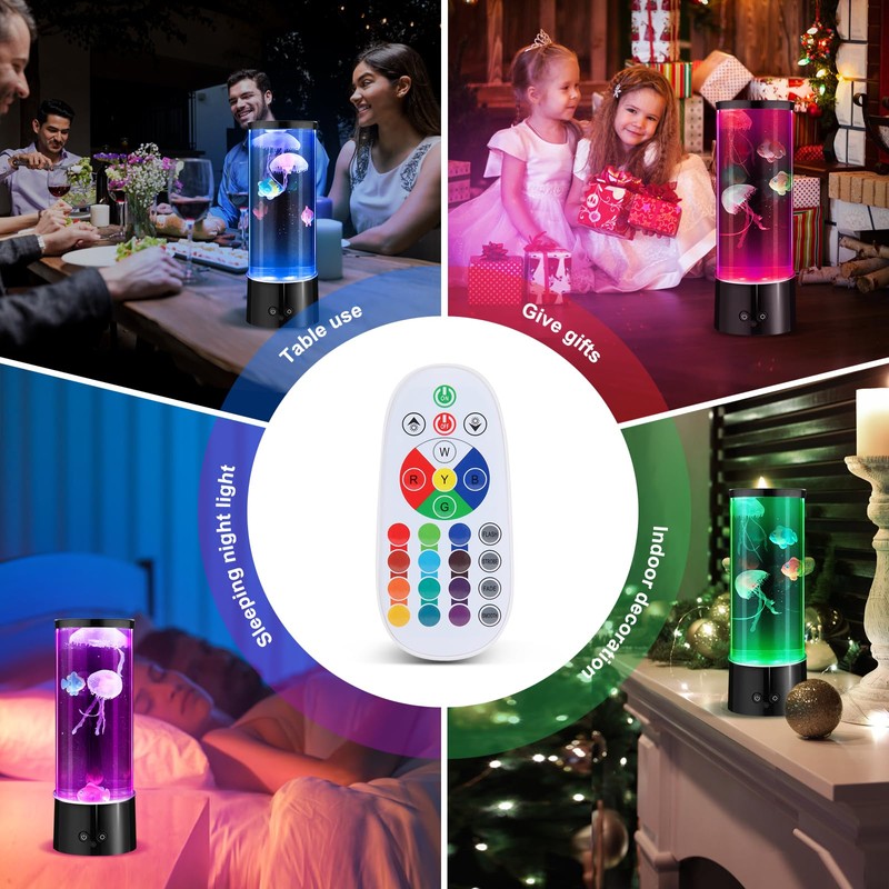 - 【Smart Design】The jellyfish light is equipped with a remote control which can be set 17 kinds of RGB monochrome and 4 color changing modes,3 levels of light brightness can be set. Easy to set, just turn on/off button, controlled by remote, you can set the 17 colors to cycle through or single color, create a beautiful tranquil, peaceful & soothing deep-sea ambiance, great for help reduce stress & anxiety. Can be also operated by a button at the bottom of the lamp body.
