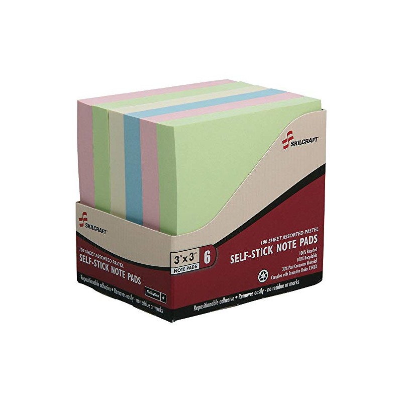 AbilityOne 4850731 Skilcraft Self-Stick Plain Note Pad, Assorted Pastel, 3" x 3"