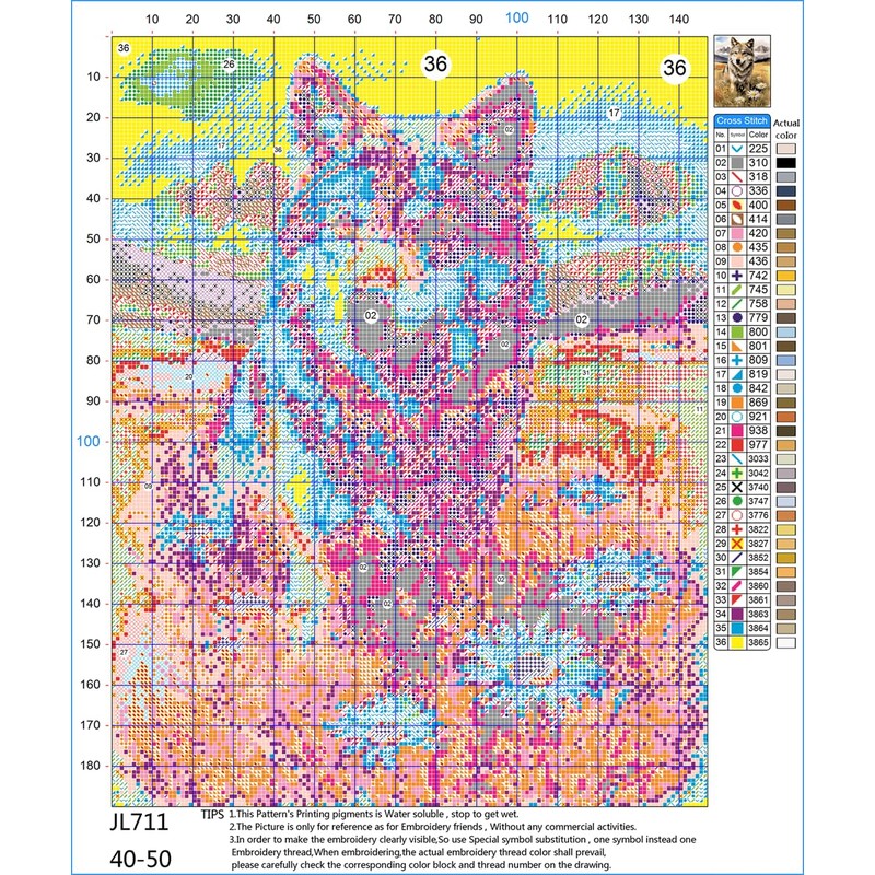 • HD Pre-Printed 👍 The fabric is clearly printed with tiny squares that are colored and labeled with symbols. Each symbol corresponds to a thread color. The symbols are written on a chart, with the corresponding thread color written below it. The chart is typically printed on the side of the canvas