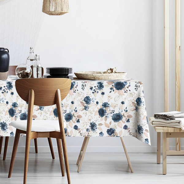 Ablecozy Blue and Golden Flower Clusters Fabric Waterproof Tablecloth,Rectangle Watercolor Wrinkle Oil-Proof Resistant Table Cover for Dining Table, Buffet Parties and Campin,(60" x 84" inch)