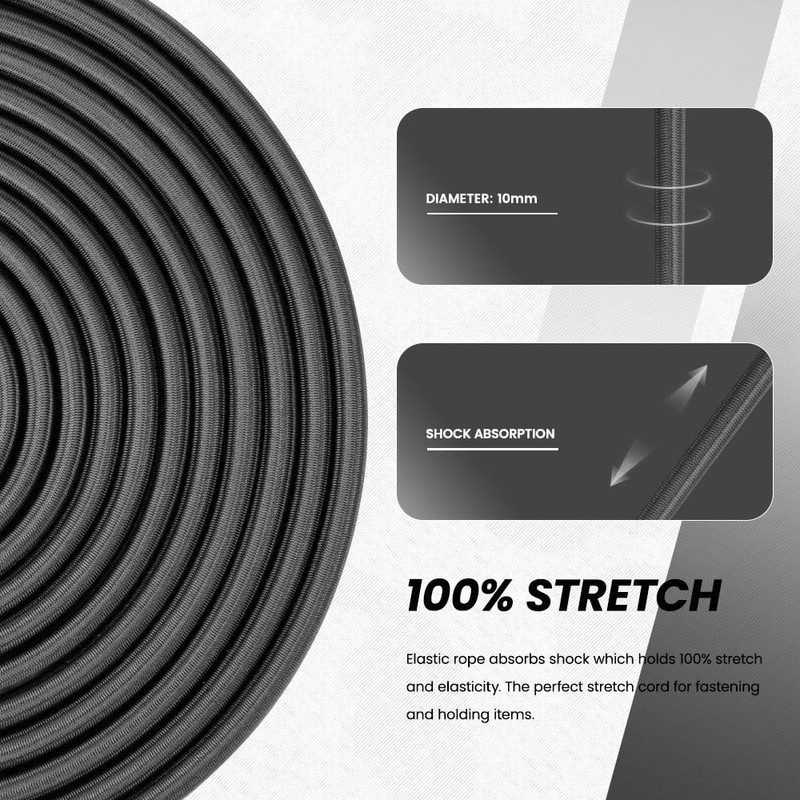- SHOCK ABSORPTION: Elastic rope absorbs shock which holds 100% stretch and elasticity. The perfect stretch cord for fastening and holding items. Easy to cut proper length.