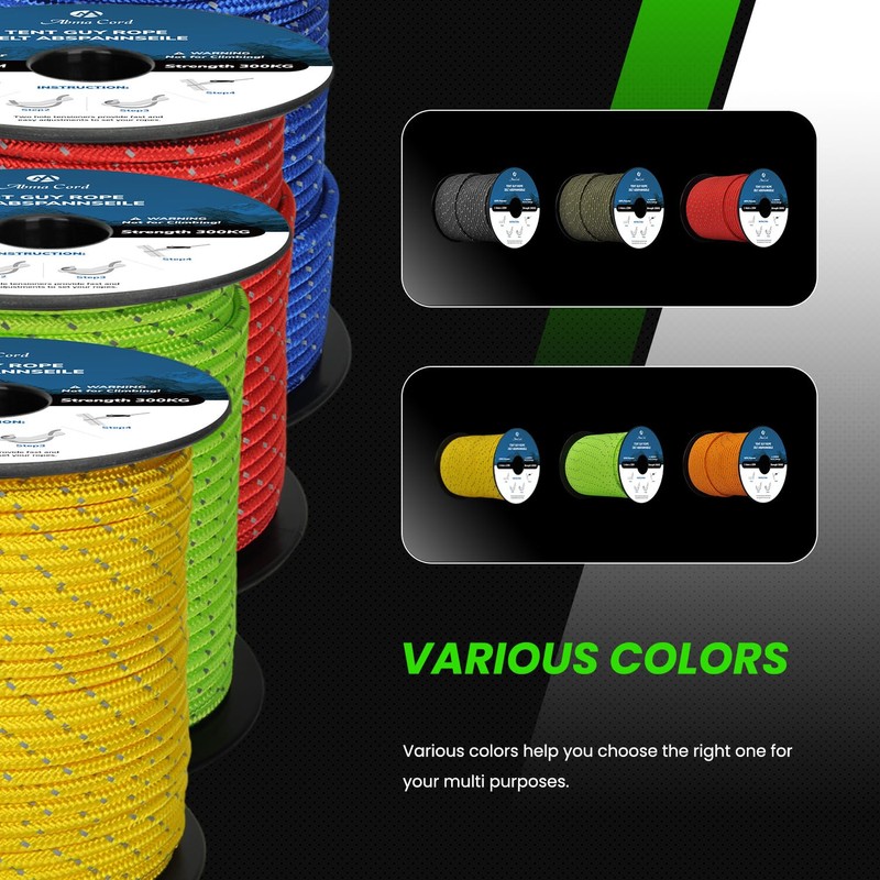 - Excellent abrasion resistance: this tent guy ropes are made of high-strength and abrasion-resistant polyester materials for low stretch. Resistant to UV rays, mildew and rot, the colour does not bleed. The outer sheath structure made of 16/1 braided polyester provides reliable support for your tent.