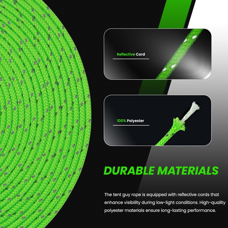 - HIGH VISIBILITY: the tent camping rope is equipped with reflective cords that improve visibility in low light conditions. High visibility for added safety, making it easier to spot your tent lines at night and not tripping over the tent.