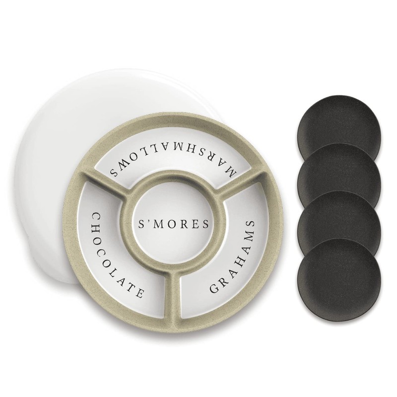 - S'Mores to go 6 piece set has everything you need to enjoy your favorite treat; Kit includes a tray with 4 convenient compartments; compartments are labeled; s'mores, grahams, chocolate, and marshmallows; includes 4 small plates that measure 5.7" diameter in black and tray and lid measure 15" diameter