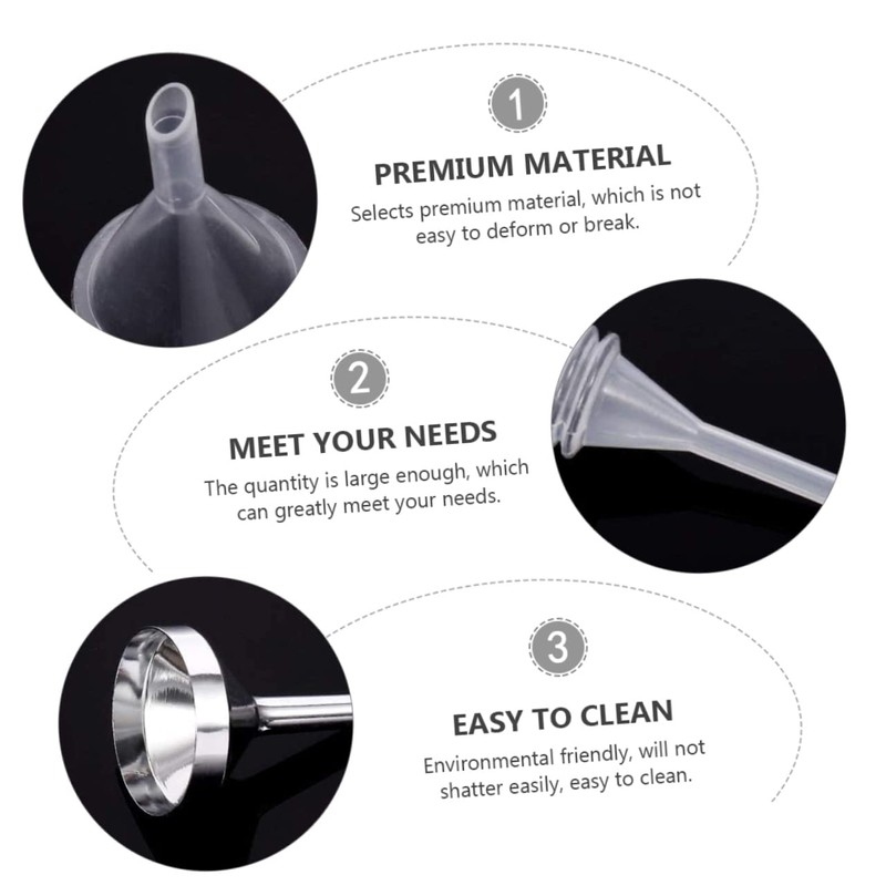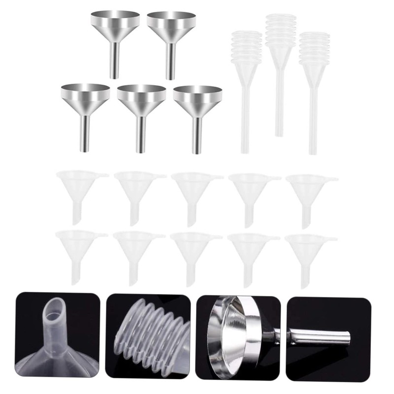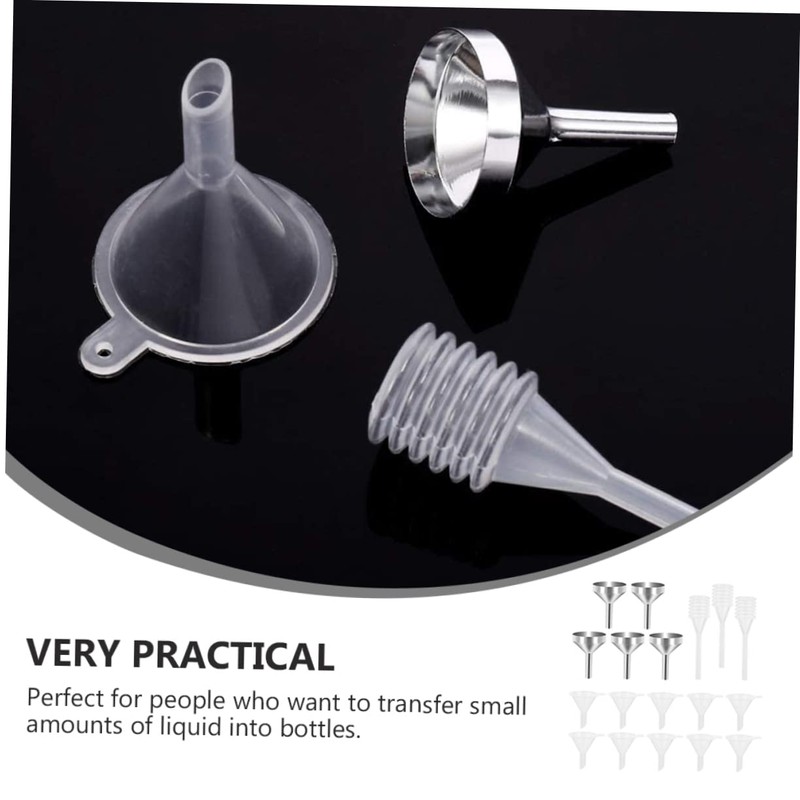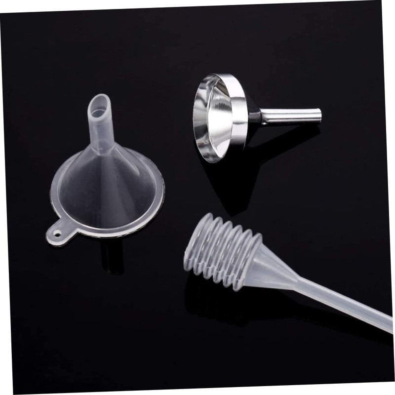 - Note: This set includes 5pcs L silver metal funnels, 3pcs 3ml spring droppers and 10pcs plastic funnels small funnel for filling small bottles.