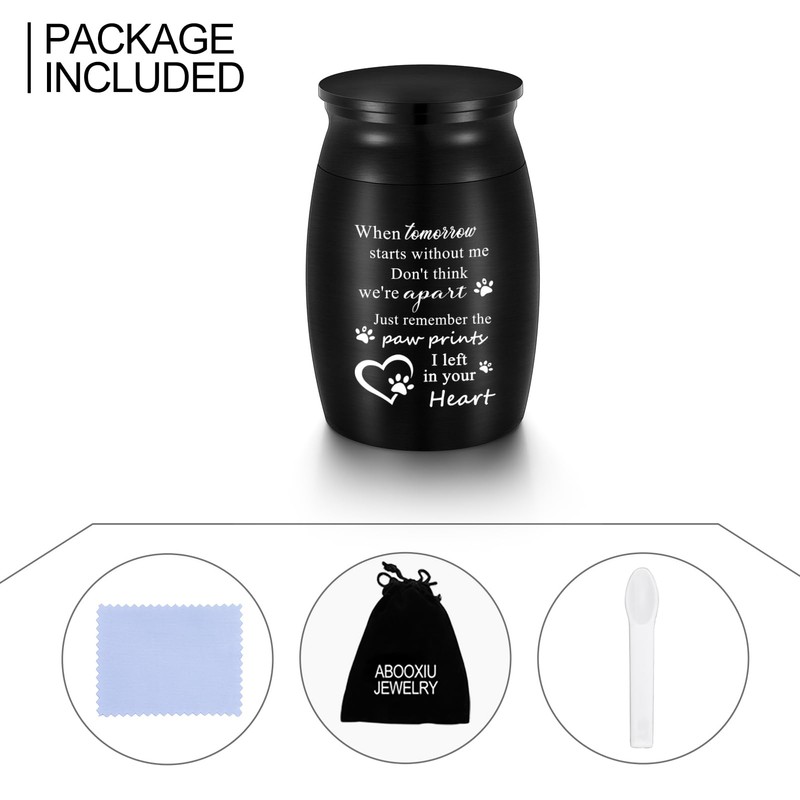 - 【Thoughtful Remembrance for Pet】If you have friends or family members who have lost their cherished pets, this delicate pet urn makes for a thoughtful and meaningful gift. The engraved words "When tomorrow starts without me Don't think we're apart Just remember the paw prints I left in your heart" offer empathy and understanding during their time of loss, showing them that they are not alone in their grief.