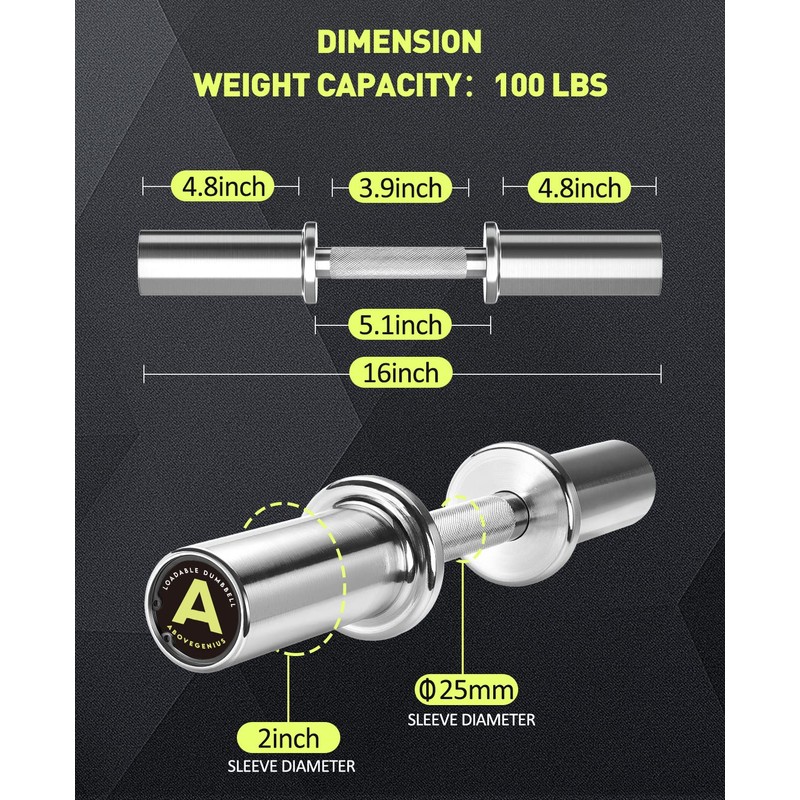 - A Great Starter Set: This set includes 2 olympic dumbbell bars and 2 spring collars. The bar is 16" in length with a 25mm handgrip diameter. Each bar weighs 8.3 LB unloaded, but reaches the weight of 8.3 LB when combined with 2 pair of spring collars