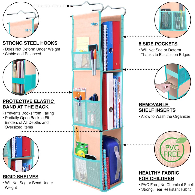 ABRA® 3 Shelf Hanging Locker Organizer for School, Gym, Work, Storage | Deep Shelves 6”x 9”| Eco-Friendly Fabric Healthy for Children | Adjustable School Locker Shelf 3 to 2 Shelves (Peach/Turquoise)