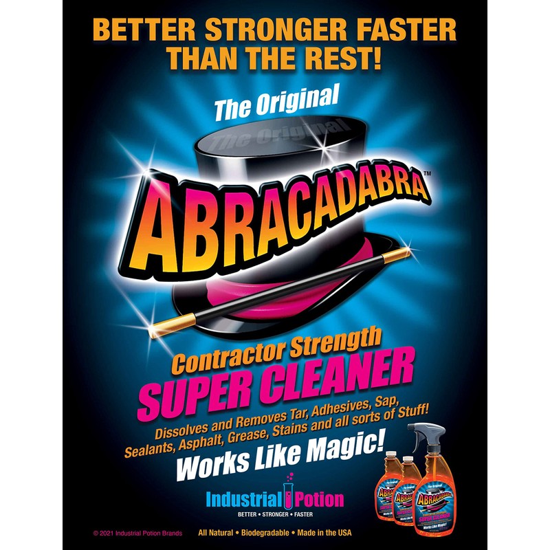 - Includes 1 Bottle of Abracadabra Contractor Strength Super Cleaner, 1 Industrial Strength Trigger Sprayer with a Viton seal.