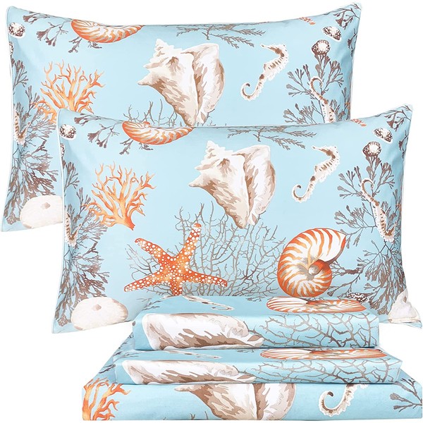 ABREEZE 100% Egyptian Cotton Sheet Set Queen Beach Themed Bedding Sets Coastal Bedding Seashells and Starfish Nautical Bedding with Deep Pocket Fitted Sheet 4-Pieces
