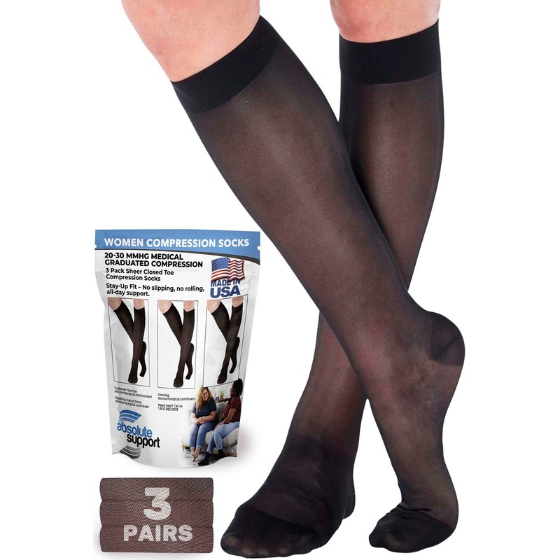 ABSOLUTE SUPPORT Made in USA - Sheer Compression Socks for Women 20-30mmHg | For Swelling, Lymphedema, DVT, Post Surgery Recovery,3 Pairs - Black, Large, A205