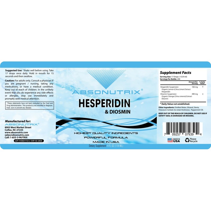 Absonutrix Hesperidin and Diosmin Liquid Drops,593mg 4Oz,Easy Absorption,Helps Improve Mobility,Supports Circulation, Made in USA,Non-GMO,Gluten-Free,GMP-Certified.