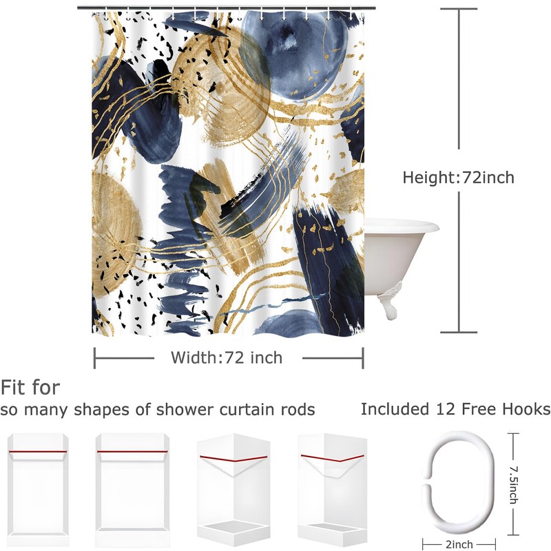Abstract Blue Gold Shower Curtain, Boho Aesthetic Unique Modern Minimalist Simple Bathtub Curtains Decor for Bathroom Set, Washable Fabric Cloth Waterproof with 12 Hooks, 72x72 Inch