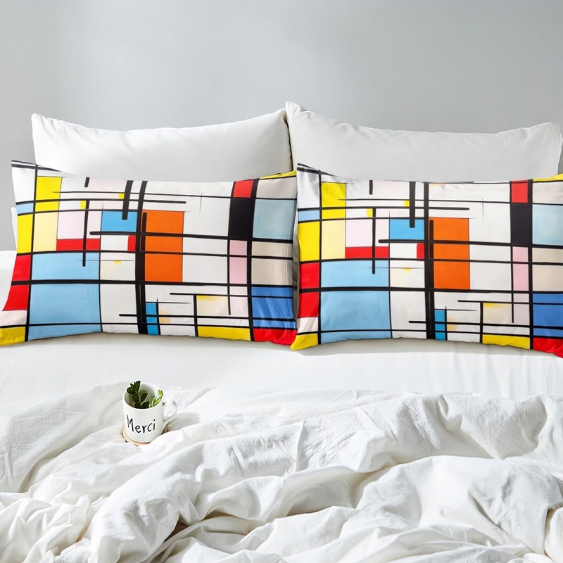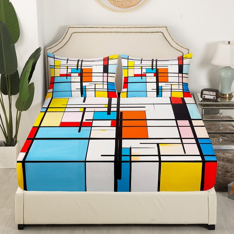 Abstract Squares Kids Sheet Full Size,Geometry Stripes Bedding Set,Boys Girls Room Decor,Geometric Grids Patchwork Modern Fashion Blue White Bed Sheet Set 4pcs(Fitted + Flat + 2 Pillowcases)