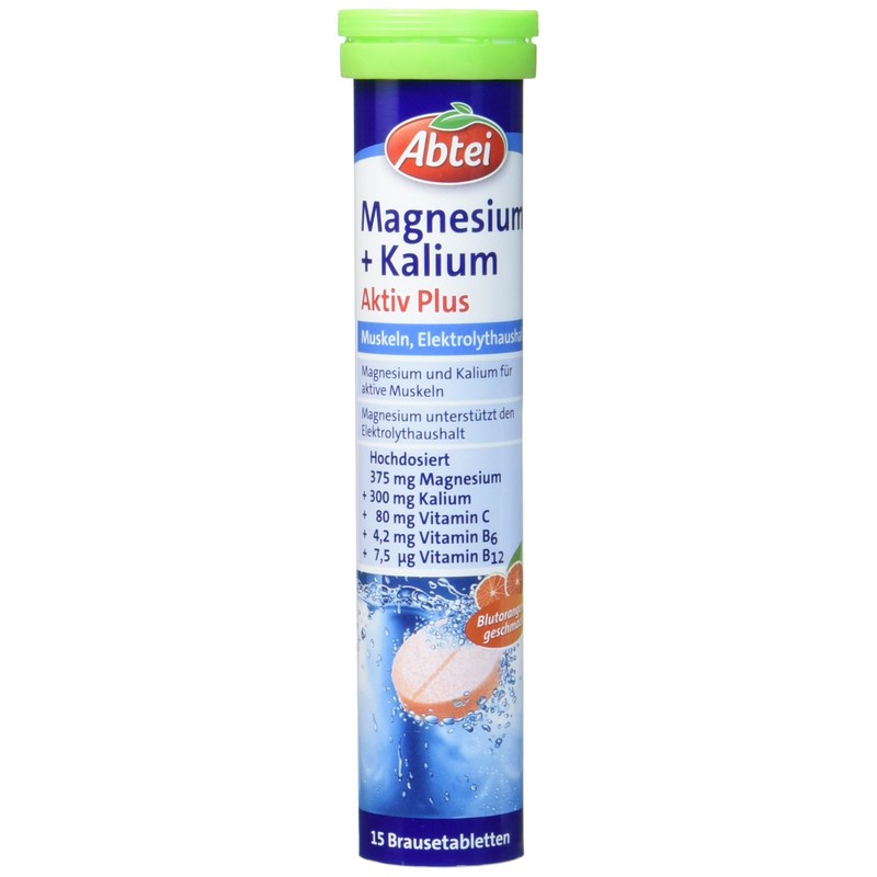 Abtei Magnesium + Kalium Aktiv Plus - Nahrungsergänzung für die Muskeln und den Elektrolythaushalt - hochdosiert - Blutorange-Geschmack - 1 x 15 Brausetabletten