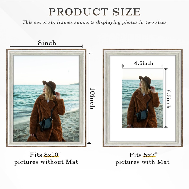 - 【Sizes】The 8x10 picture frame supports placing photos of two sizes. Using the mat, you can place a 5x7-inch photo; without the mat, you can place an 8x10-inch photo