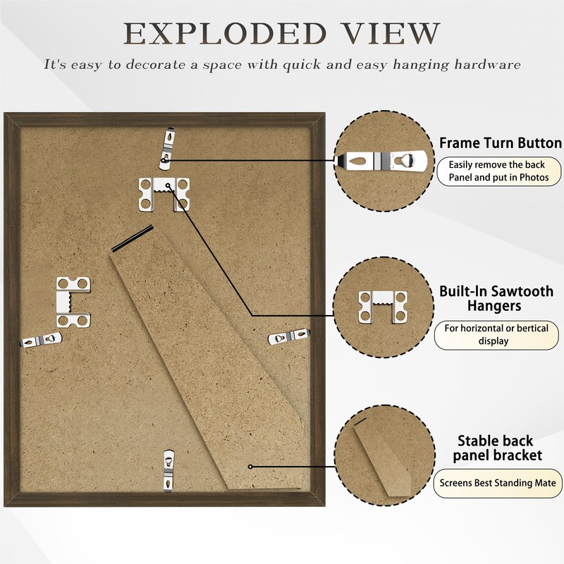 - 【Multiple Display】8x10 frame comes with a stand and two hanging hooks on the back. You can hang them on the wall or place them on a desktop, desk or shelf, both horizontally or vertically
