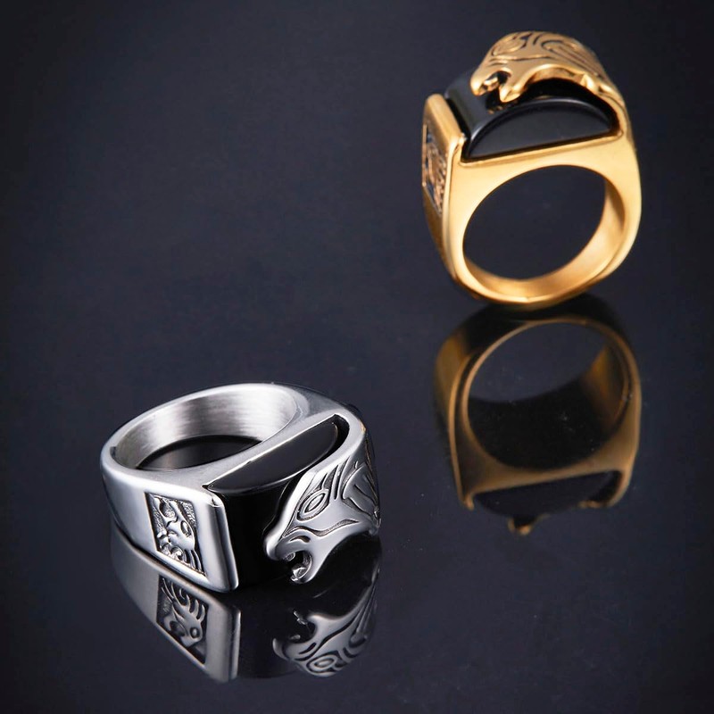 ABUAMO Mens Lion Ring Stainless Steel Unique Statement Signet Onyx Ring Size 7-13, Non-Precious Metal, Cubic Zirconia