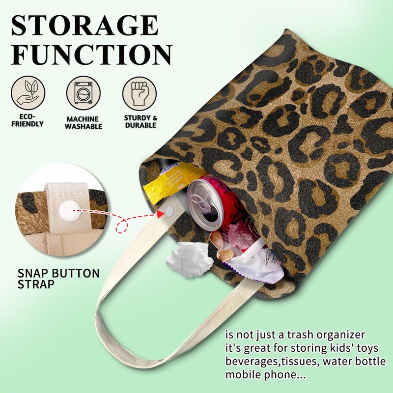 ABUIFDK Car Trash Can, Cute Car Trash Bag, Hanging Car Organizer and Storage Bag, Trash Bin for Car Accessories, Vehicle, Travelling, Camping Black Gold Leopard