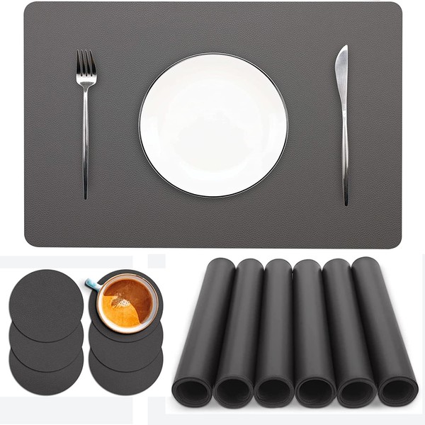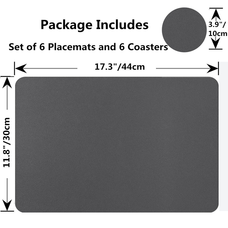 Abuzhen Placemats Set of 6, Faux Leather Place Mats with Coasters, Waterproof, Stain Resistant, Heat Resistant, Easy to Clean PU Table Mats for Dining Table and Decor (Set of 6, Rectangle Dark Gray)