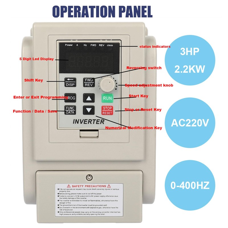 - VFD Drive Inverter: Model name: Single phase input and 3 phase output vfd drive; Input voltage: 220V(+/-15%); Output voltage: 220V; Input frequency: 50/60 Hz, Output frequency: 0-400 Hz; Power Rating: 2.2 KW/12A; Rated Load: 3HP; Output Volt Adjusting Method: PWM Control.