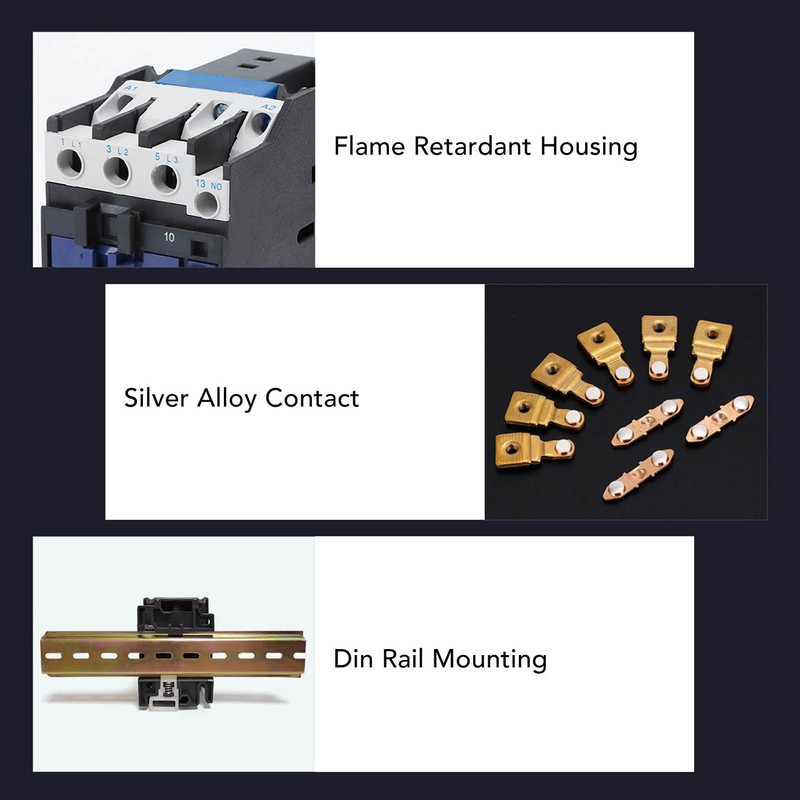 1、3P Normally Open: Stable connection contact, stable connection contact, strong conductivity, high temperature resistance. Operating frequency up to 1,200 times per hour, high sensitivity, greater load carrying capacity, effective maintenance of power circuits. 2、Has High Bearing: Silver alloy contacts have strong electrical conductivity, carry greater current, and have a smoother suction, with a guaranteed 32 piece iron core. 3、Good Copper Coil: Industrial electrical appliances that utilize a strong resistance copper coil to carry current and generate a magnetic field at closed contacts to achieve electrical installation and control of loads. 4、Reliable Working: PC flame retardant housing and high performance engineering plastic, protecting electrical safety, high sensitivity, and strong bearing capacity. 5、Quick to Install: Convenient anti crack snap design, 35mm standard clip rail installation, widely used for remote connection and disconnection of circuits, frequent starting and control of AC motors.