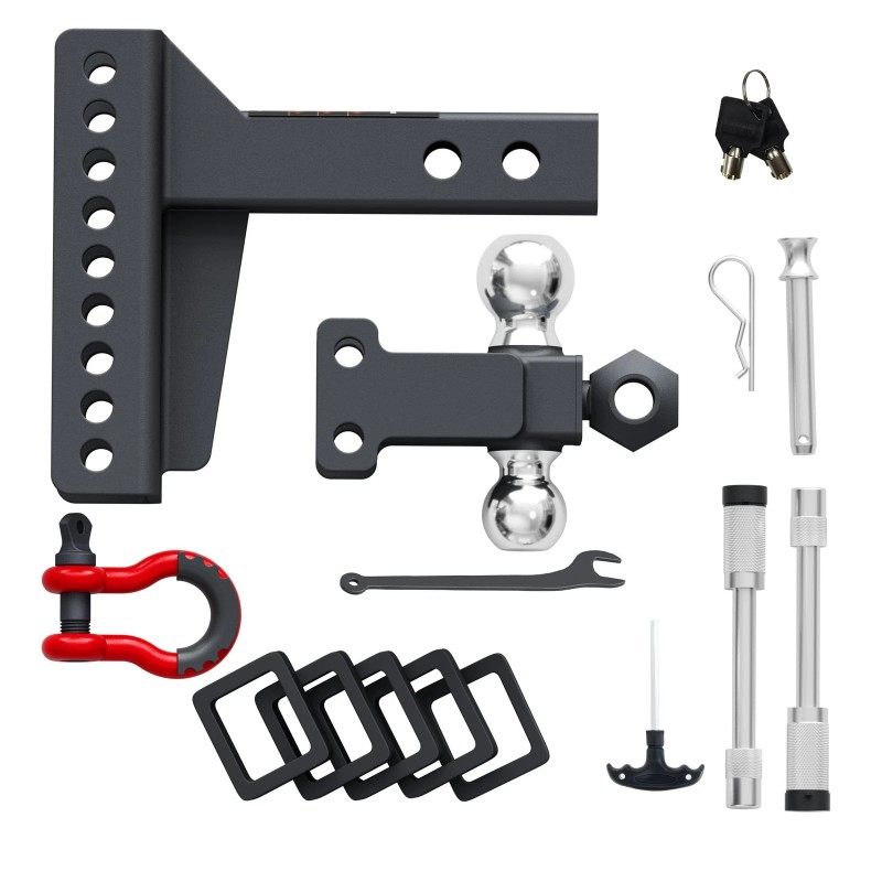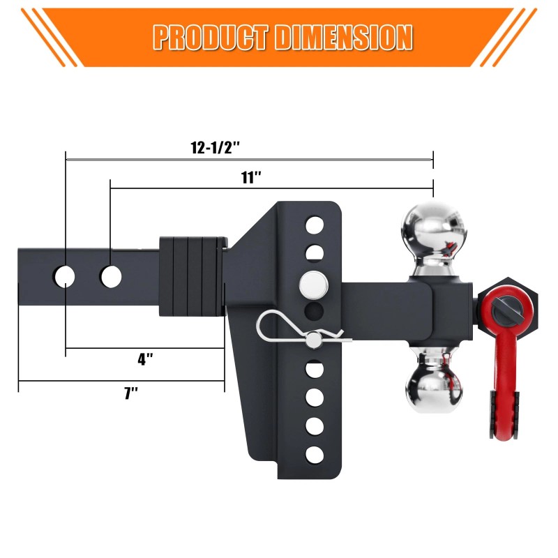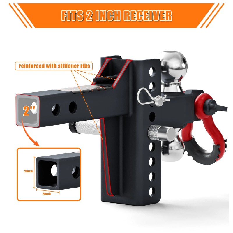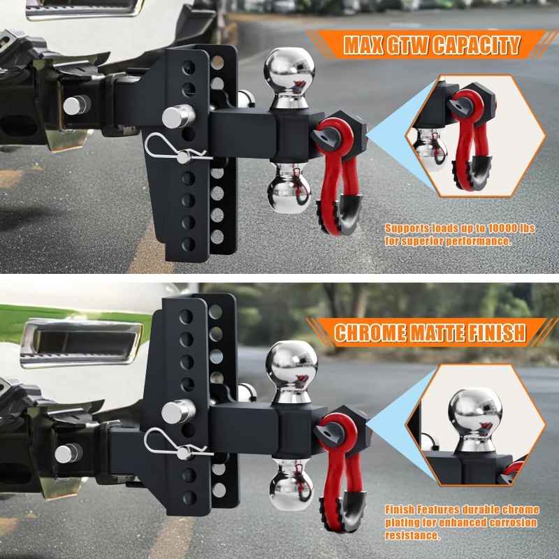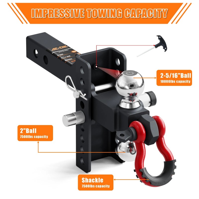 Adjustable Design: Features precise and rapid 4-inch lowering and raising capabilities, meeting diverse height requirements and making the towing process more flexible and convenient Multifunctional Design:Compatible with 2-inch receivers, the AC-DK Trailer Hitch includes a 7,500 lbs 2-inch ball, a 10,000 lbs 2-5/16-inch ball, and a 7,500 lbs 3/4" D-shaped release latch Double Security Lock:Features a dual-locking pin for hitch ball adjustment and hook security User-Friendly Design:Includes four noise-reducing pads that dampen vibrations and noise, ensuring a quiet and smooth towing experience Stable & Quiet Towing:Equipped with anti-loosening screws, tightened with the included wrench, to prevent movement between parts