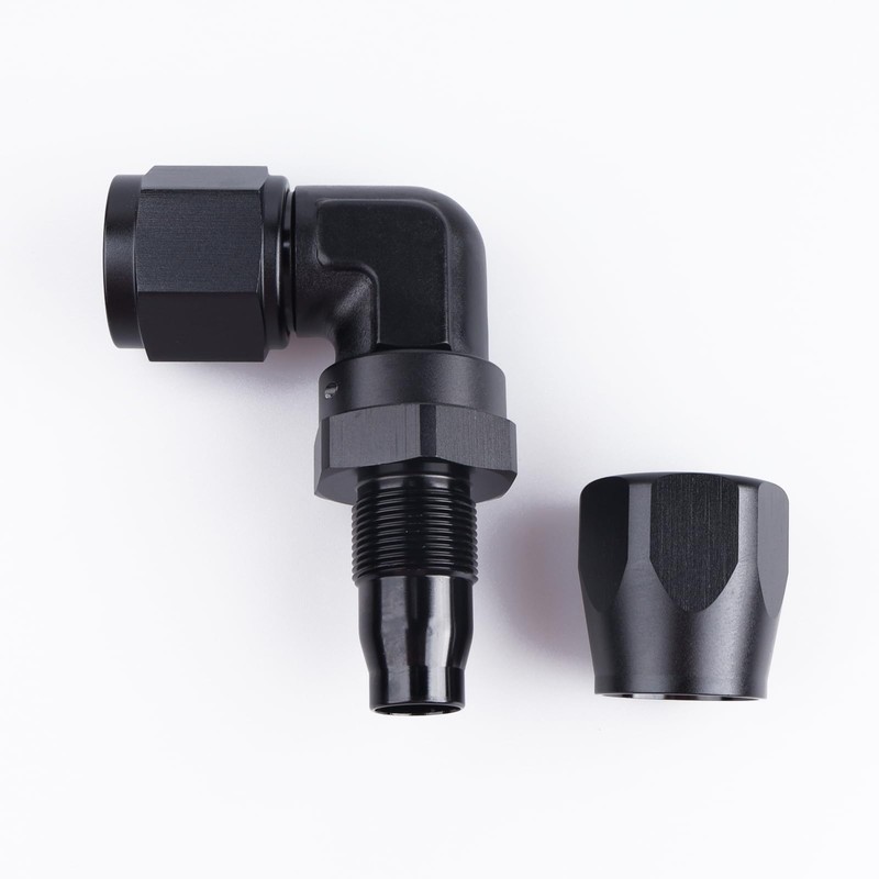 - 10AN female hose swivel fitting to a -10AN nipple and cutter barb end