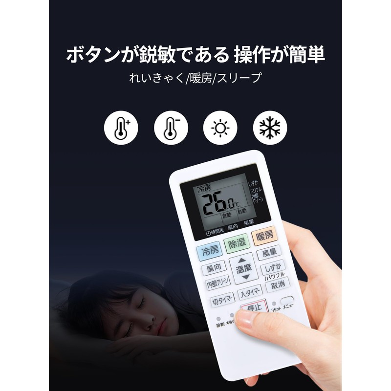 - Easy to Operate: Equipped with basic functions of a general use air conditioner, a large button is easy to operate, and the letters are clearly placed on the button to reduce eye fatigue and provide comfortable operation. It is easy to press and stable even when placed on. You can pinch, squeeze and operate it while you put it. ※Some models may not be used for certain functions