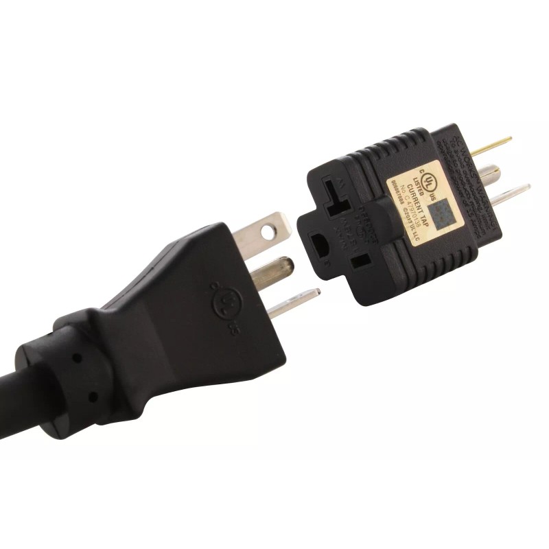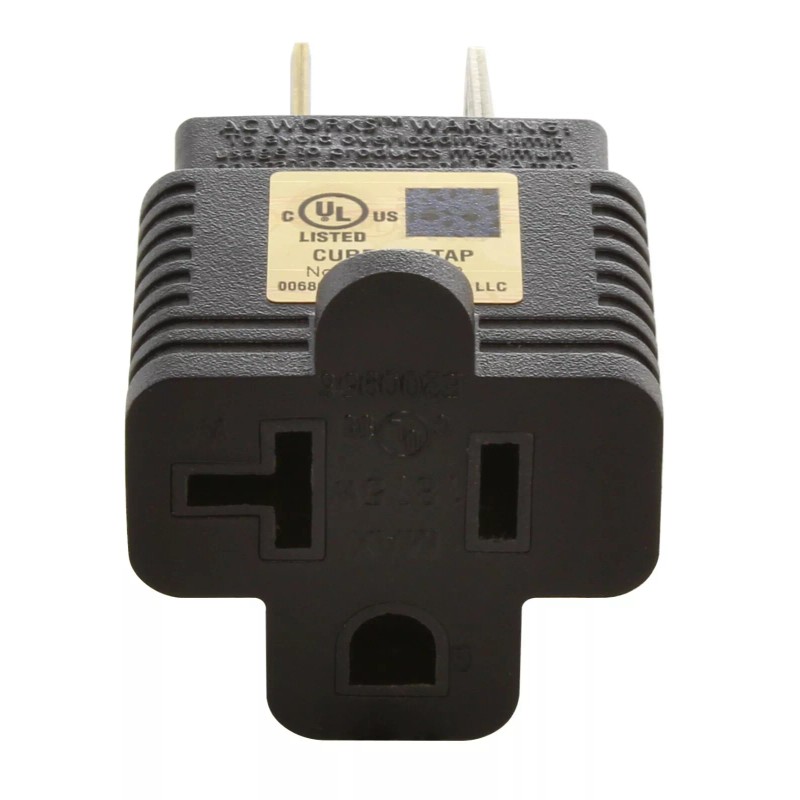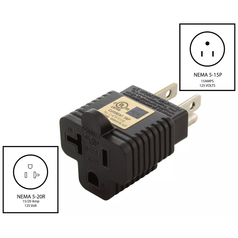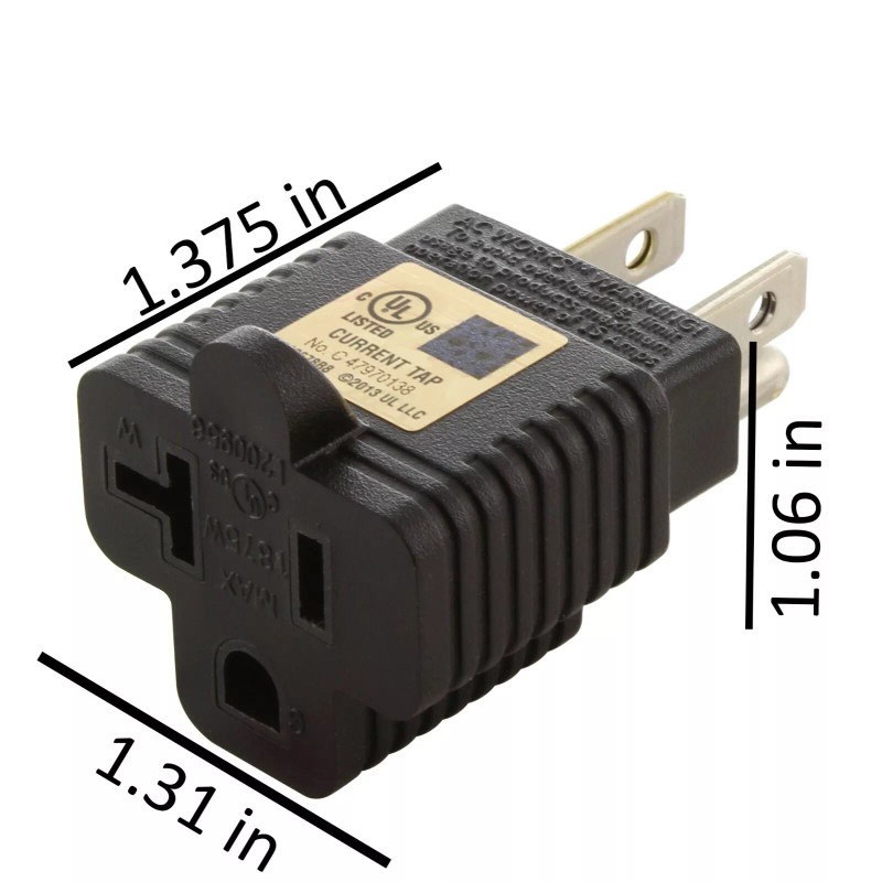 This AC WORKS® brand household T-blade adapter is compact and durable. It is rated 15 Amp to 20 Amp with 125 Volts and a maximum operating power of 1875 Watts. If you would like a copy of the warranty information, please send us a message, and we will be happy to supply you with a copy.
