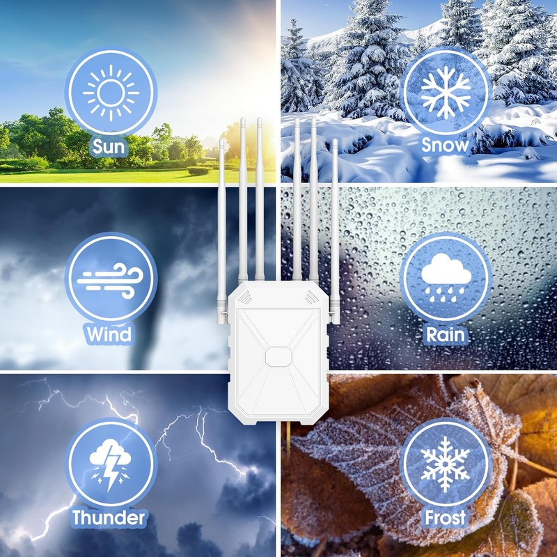 【High-Speed Dual-Band Performance】This outdoor wifi extender supports dual-band (5GHz/867Mbps and 2.4GHz/300Mbps) and is equipped with six 8dBi antennas, which provides wider signal coverage, stronger signal penetration, and faster Internet speeds, allowing you to receive stable signals and enjoy a fast Internet experience, even when you are outdoors watching high-definition videos and playing games experience. Outdoor access point is suitable for Starlink, Yard, Camping and other large spaces