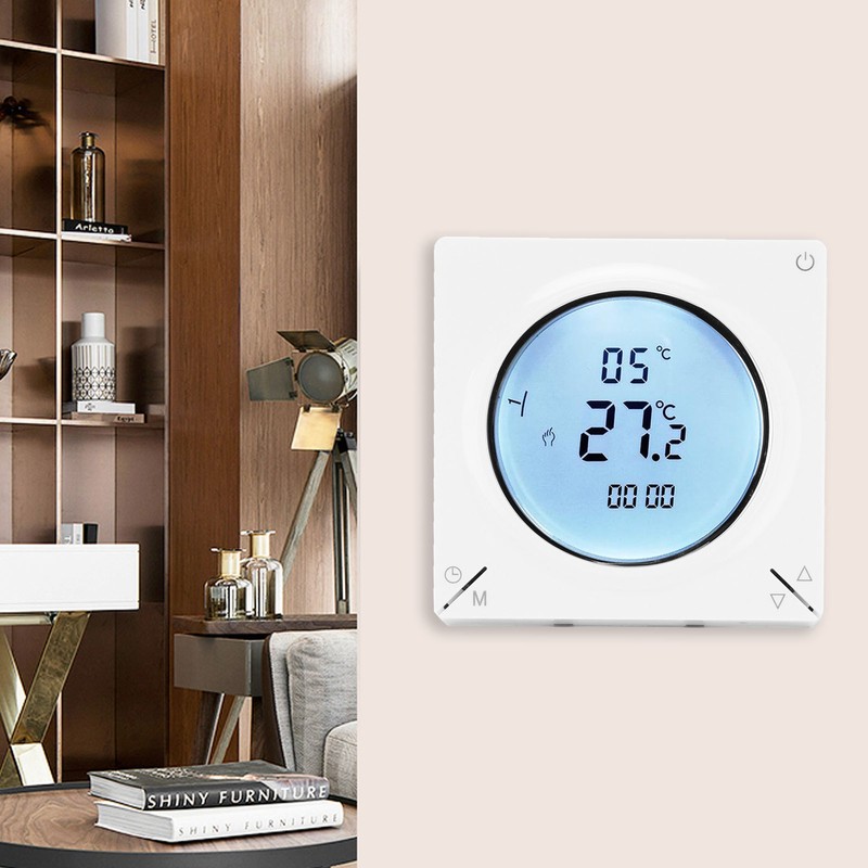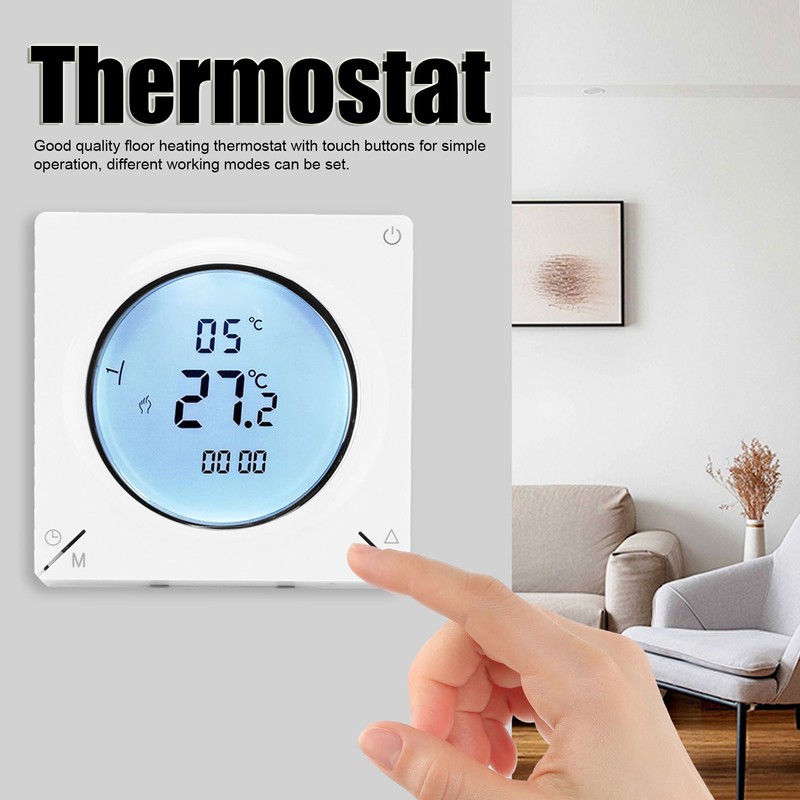 1、Good quality floor heating thermostat with touch buttons for simple operation, different working modes can be set. 2、Large LCD display screen can display data clearly, easy to read data, easy to use and practical. 3、Using NTC thermistor temperature sensor, high precise, fast data reading. 4、Using high‑reliability chips, strong anti‑interference ability and high reliability. 5、Has a wide range of use, suitable for living room, bedroom, dining room, hall, etc.