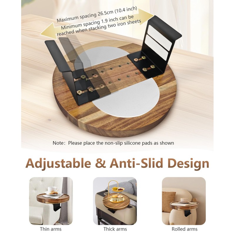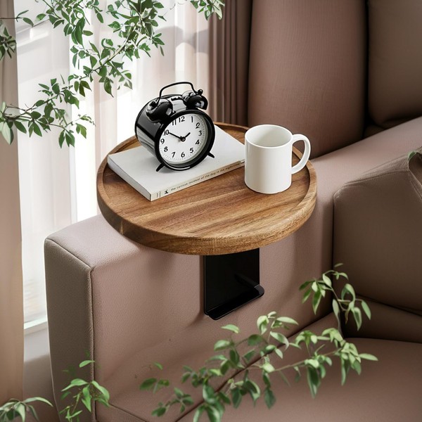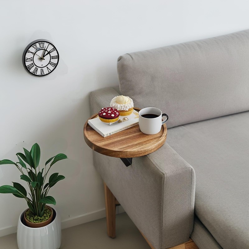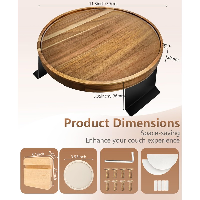 Natural Wood Couch Arm Table – Adjustable Clip-On Tray with Phone Holder Upgrade your home with our Natural Wood Couch Arm Table, crafted from premium Rubberwood for durability and a natural, eco-friendly finish. Its unique grain adds rustic charm to your space, while the non-toxic finish ensures safety for your family. Perfectly sized to fit most sofa arms, this tray combines style with everyday functionality. Durable & Stylish Made from sturdy Rubberwood, this tray features a beautiful wood grain pattern and a non-toxic finish. It’s not only stylish but also built to last, making it a practical addition to your home. Stable & Secure With extended metal clamps and anti-slip silicone pads, this tray stays securely in place, preventing slipping and protecting your sofa from damage. You can confidently place drinks, snacks, phones, and more without worry. Adjustable & Versatile The tray fits armrests ranging from 1.77 to 10.3 inches wide, offering a custom fit for various sofas. It’s lightweight, easy to install in minutes, and gives you easy access to your essentials without getting up. Multifunctional & Easy to Install Perfect for holding remotes, drinks, snacks, and phones, this tray has a grooved surface to keep items secure and a smooth finish for easy cleaning. Installation is quick and tool-free, and it’s ideal for sofas, chairs, bathtub edges, or RVs. Perfect Gift This space-saving sofa tray is a thoughtful gift for family and friends. Great for those who enjoy relaxing at home, especially the elderly, pregnant women, or anyone with limited mobility. Practical, stylish, and something they’ll use every day.